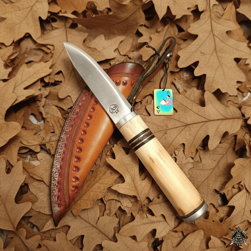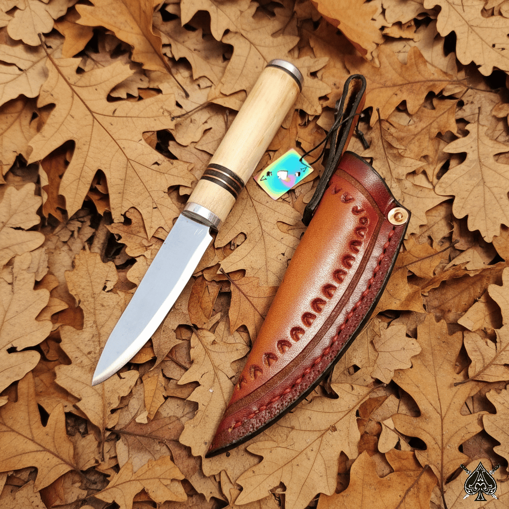 EL ALMA DE LA PIEZA: Cuchillo tipo puukko (cuchillo tradicional finlandés), forjado a mano desde un muelle de vehiculo, tratado térmicamente con temple en aceite y revenido para garantizar dureza y tenacidad.